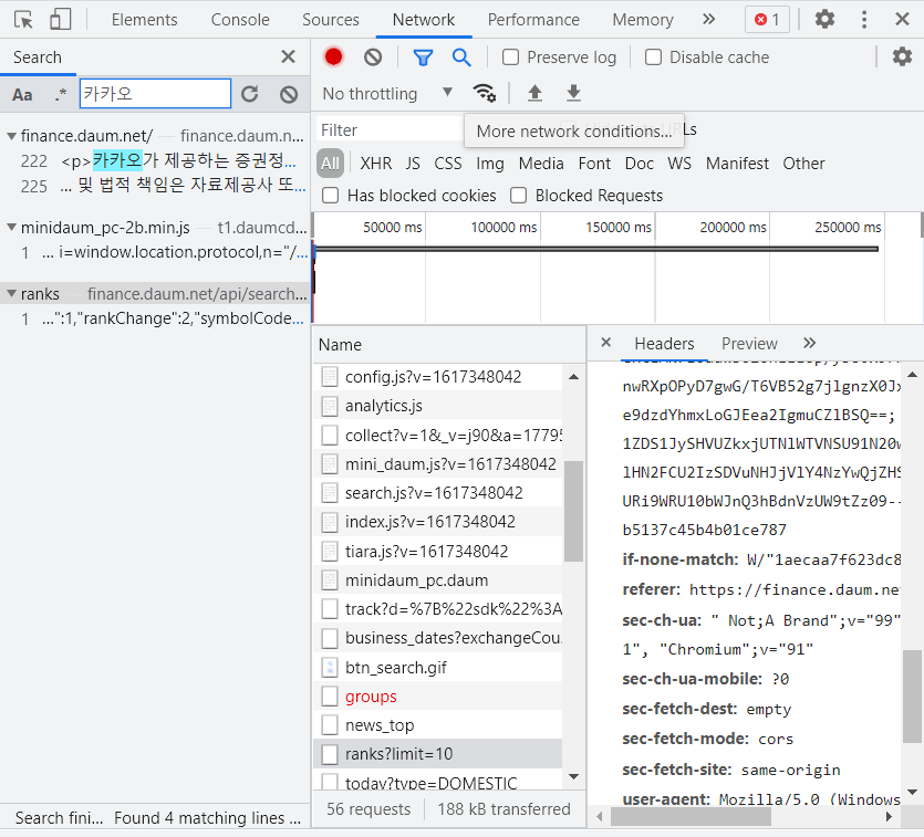 개발자 도구 -> network -> search(돋보기 모양 클릭) -> 카카오 검색
