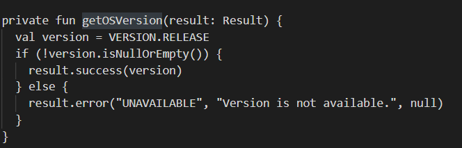 아까 만든 메소드채널 객체를 통해, invokeMethod를 실행하고 있고, 그 안에는 'getOSVersion' 이라고 적혀있다.