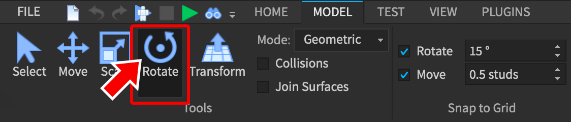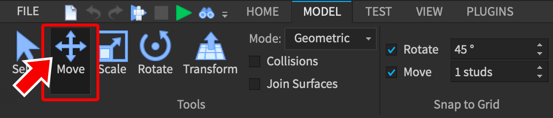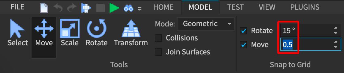 로블록스에서는 stud가 기본 측정 단위입니다. 만약 part들이 일정 거리씩 움직이거나 45도 씩 회전한다면, 이것은 스내핑 때문입니다. 스내핑은 빌딩에 벽을 만들 때 처럼, 정확히 일치하도록 parts를 움직일 때 유용한 기능입니다.To adjust the snap amount, enter a different number for Rotate or Move, or click the small arrows within the fields.