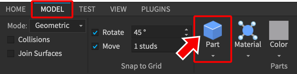 - Make sure the new part is selected (click on it in the game editor window).