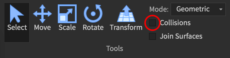 Collisions 옵션은 part를 움직일 때 다른 오브젝트가 있으면 겹쳐지는지, 아니면 더 이상 움직이지 않게 하는지를 결정합니다. collisions는 옆에 체크 박스를 통해 껐다 킬 수 있습니다.