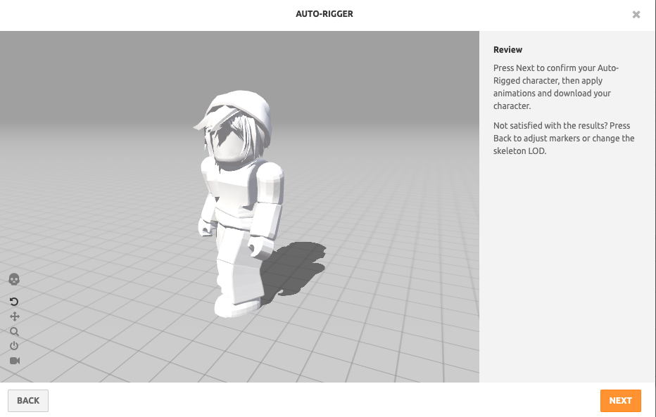 - 그리고 next를 누르면 auto-rigging이 시작된다. Mixamo가 캐릭터의 팔다리 관절 등을 계산해 애니메이션 데이터를 입힐 수 있는 준비를 하는 것이다.