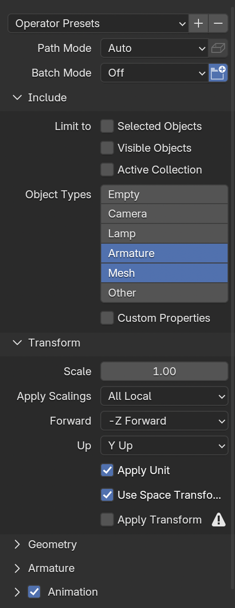 - 우측, Object Types에 "Armature, Mesh" 2개만 선택한다. shift 누른채 클릭하면 복수 선택됨.